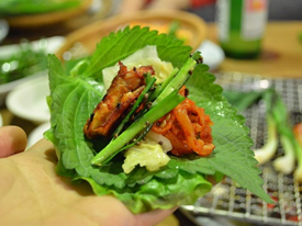 쇠고기는 단백질과 아미노산이 다량으로 함유되어 있지만 칼슘과 비타민이 없기 때문에 비타민이 풍부한 깻잎에 싸서 먹으면 부족한 영양분을 보충할 수 있습니다.