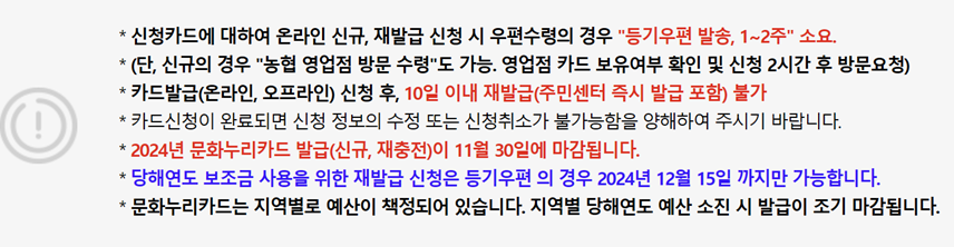 - 2023년도 발급자 중 수급자격을 유지하는 경우에는 보유한 카드에 자동 재충전이 됨. 자동 재충전 완료자에게는 1월 말 문자 안내 예정