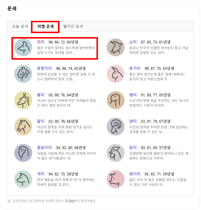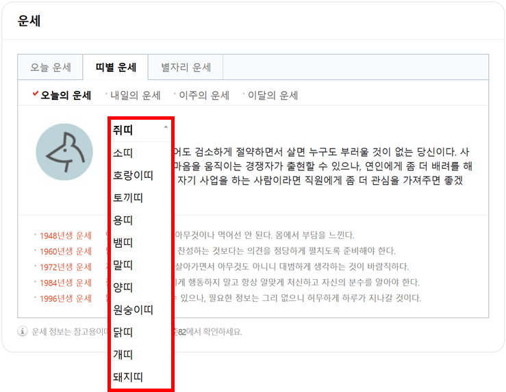 ★ 상단 띠별 운세 클릭 하면 띠별 운세를 확인 할 수 있고 본인 띠를 클릭하면