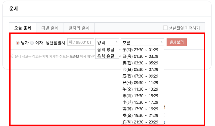 남자, 여자 선택 ▶ 생년월일 입력(예, 19800101) ▶ 양력, 음력 평달, 음력, 윤달 선택 ▶ 태어난 시간 선택 ▶ 운세보기 클릭