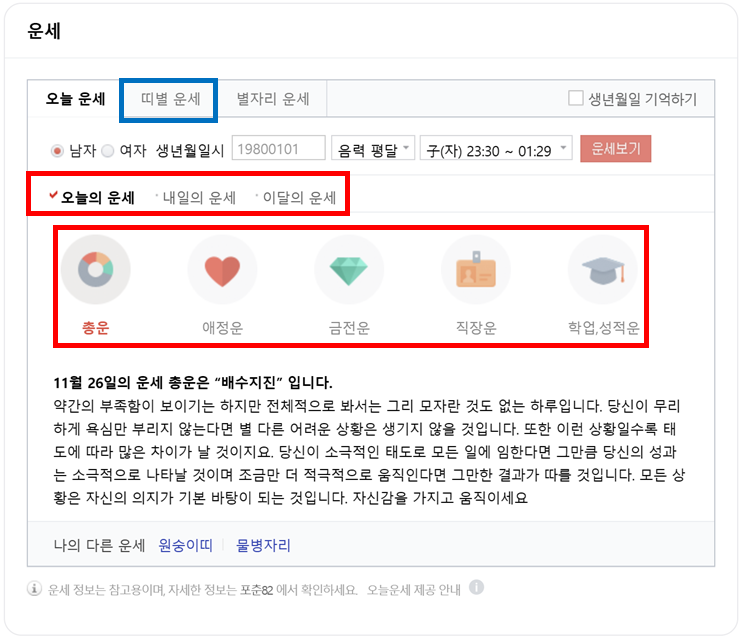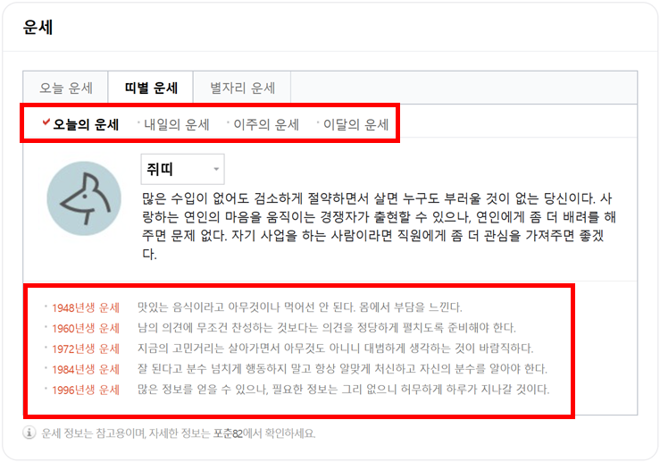 띠별 오늘의 운세, 내일의 운세, 이주의 운세, 이달의 운세와 태어난 생의 운세도 확인할 수 있습니다.