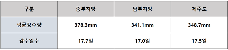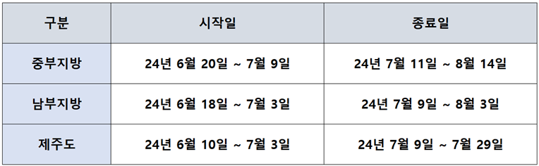 매년 어김없이 찾아오는 장마, 2024년 장마기간 중부지방 남부지방 제주도 올해 장마시기 종료일 평균 강수량 관해서 알아보겠습니다. 우리나라의 경우 장마기간의 강수량이 전체 강수량의 약30% 이상을 차지하고 있습니다. 장마기간은 평균적으로 30일에서 35일 정도이며 실제 비가 내리는 날은 15일~20일 정도 해당됩니다.